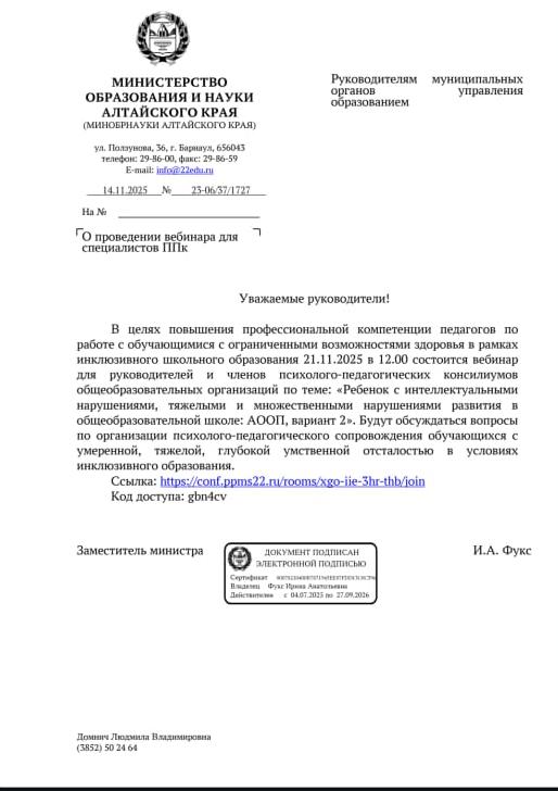 - Письмо Министерства образования и науки Алтайского края от 16.09.2025 № 23-06/37/1351 «О проведении вебинара для психологов 24.09.2025»