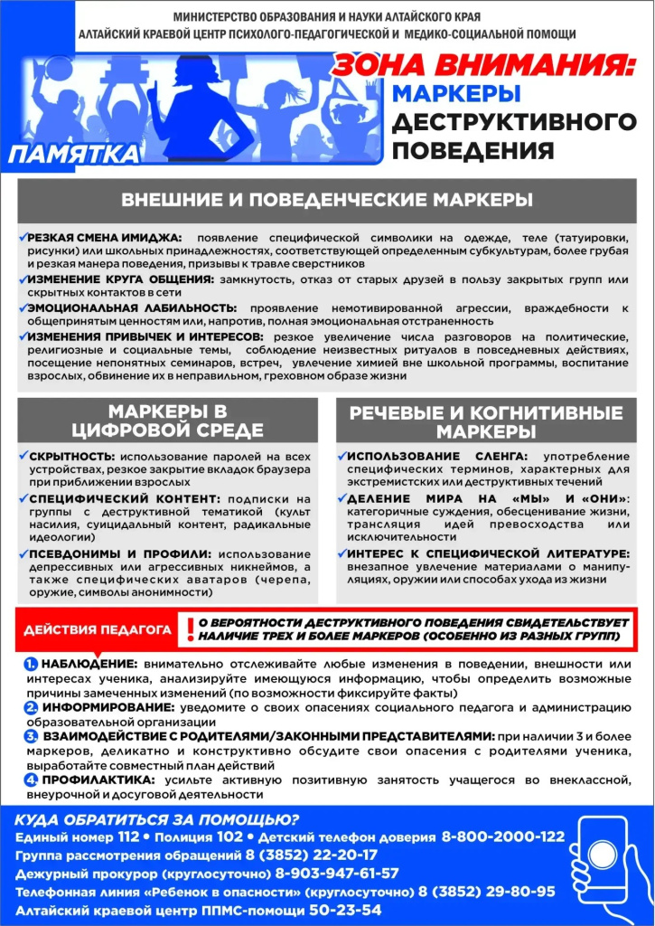 - Памятка для педагогов "Зона внимания: маркеры деструктивного поведения"