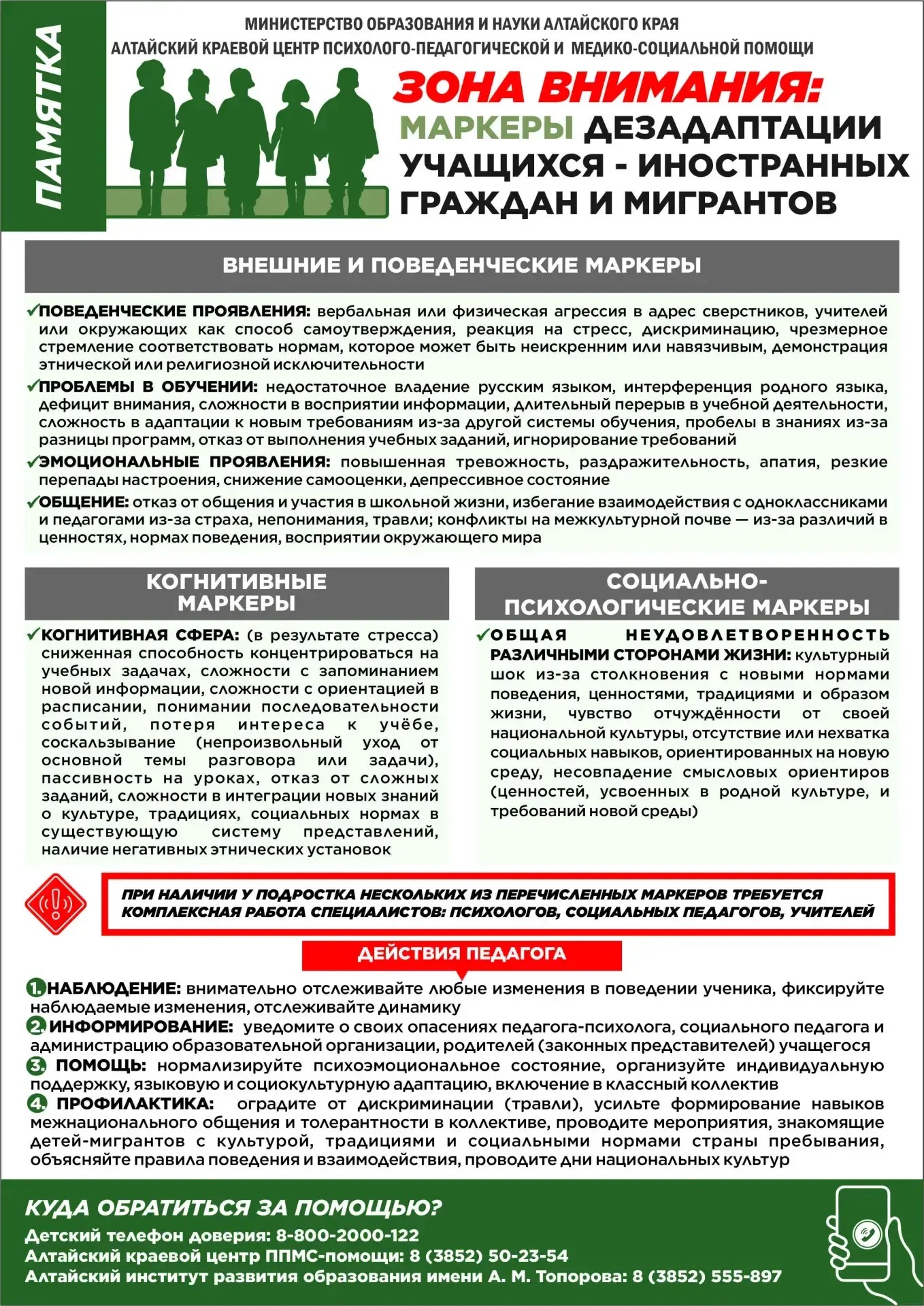 Памятка для педагогов "Зона внимания: маркеры дезадаптации учащихся -иностранных граждан и мигрантов"