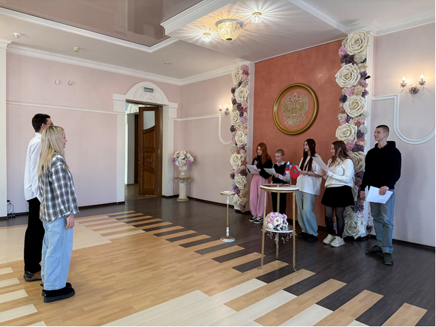 На втором этаже, посвящённом торжественной регистрации, ребята увидели отдельные комнаты для жениха и невесты, зал ожидания для гостей и главный зал бракосочетания. После знакомства с этапами церемонии подростки участвовали в интерактивной игре, где примеряли роли ведущего и брачующихся.