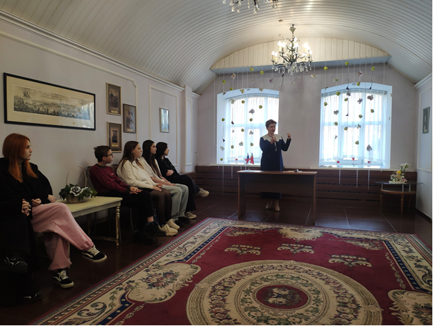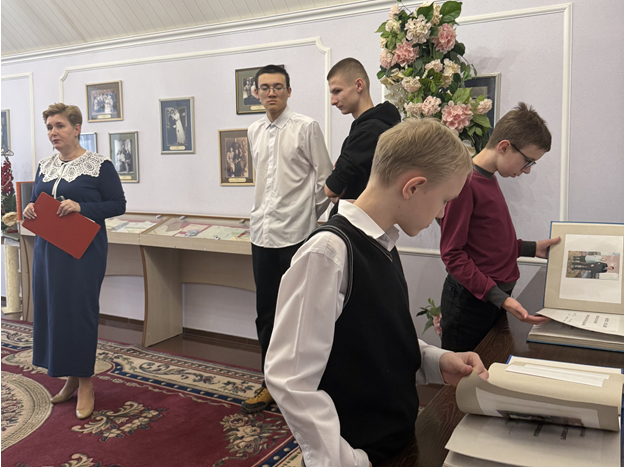 Во Дворце ребята осмотрели кабинет для неторжественной регистрации брака. Там они увидели фотогалерею, которую собирают с 1980-х годов, старинные актовые записи и юбилейные альбомы. Алла Михайловна рассказала историю здания, которое работает 146 лет, и показала, как менялась культура торжеств по архивным фотографиям.