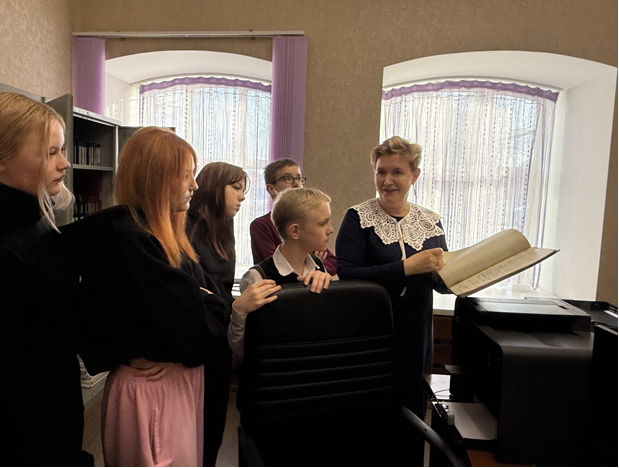 Затем группа побывала в рабочих кабинетах, где принимают запросы от граждан и хранят архив. Учащихся удивил масштаб документооборота, они сравнили оформление актовых записей прошлого и настоящего.