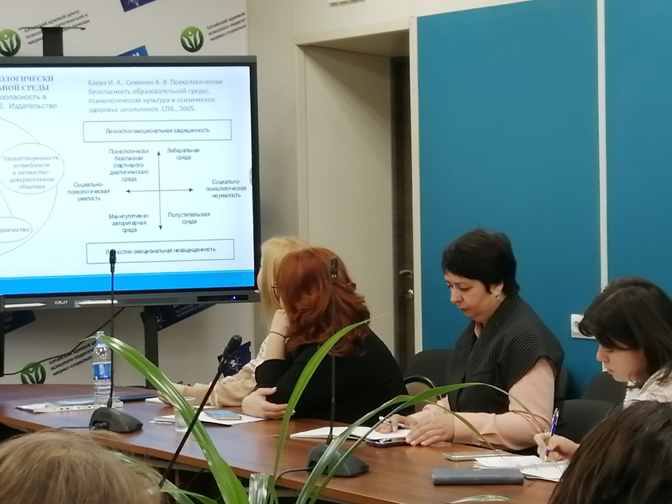 «Психологически безопасная образовательная среда - это результат комплексного, системного, длительного, специально организованного психолого-педагогического процесса, поэтому в каждой образовательной организации необходимо принятие Политики психологической безопасности», - подчеркнула Елена Мазурова, заведующий отделом психолого-педагогической помощи Алтайского краевого центра ППМС-помощи. Особое внимание она уделила Плану мероприятий по обеспечению психологической безопасности функционирования образовательной организации, диагностическим и практическим методам, способам и приемам обеспечения комфортности и защищенности участников образовательного процесса.