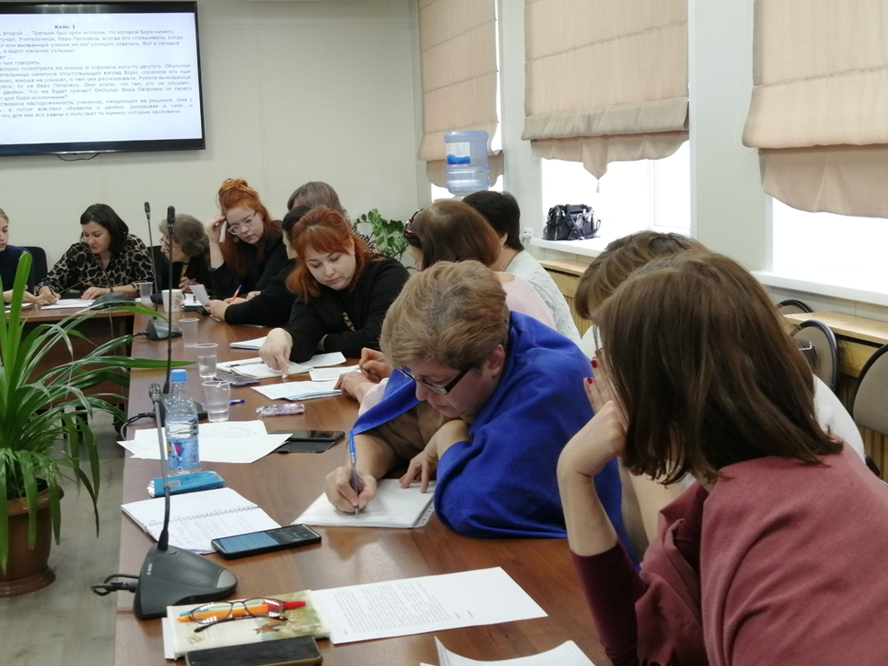 Отдельная тема программы была посвящена буллингу и кибербуллингу в образовательной среде. Педагог-психолог Алтайского краевого центра ППМС-помощи, Александра Сартакова выделила факторы, повышающие риск насилия в образовательной среде, подробно остановилась на проявлениях его видов и стратегиях нерезультативных педагогических мер в отношении зачинщика и жертвы. Полученная теоретическая информация была закреплена на практическом занятии в работе с предложенными кейсами.