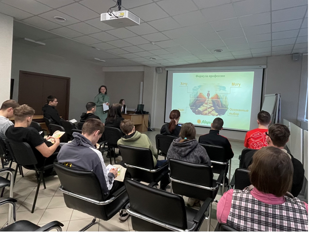 Встретила гостей менеджер сектора корпоративной культуры Наталья Васильевна Межевых. В теплой, доверительной атмосфере она побеседовала с ребятами о важности ответственного отношения к выбору профессии, поделилась личным опытом и профессиональными успехами. Наталья Васильевна представила участникам формулу осознанного выбора и подчеркнула: «Правильно выбранная профессия — это фундамент не только для успешной карьеры и благоприятной рабочей среды, но и для гармоничной личной жизни».