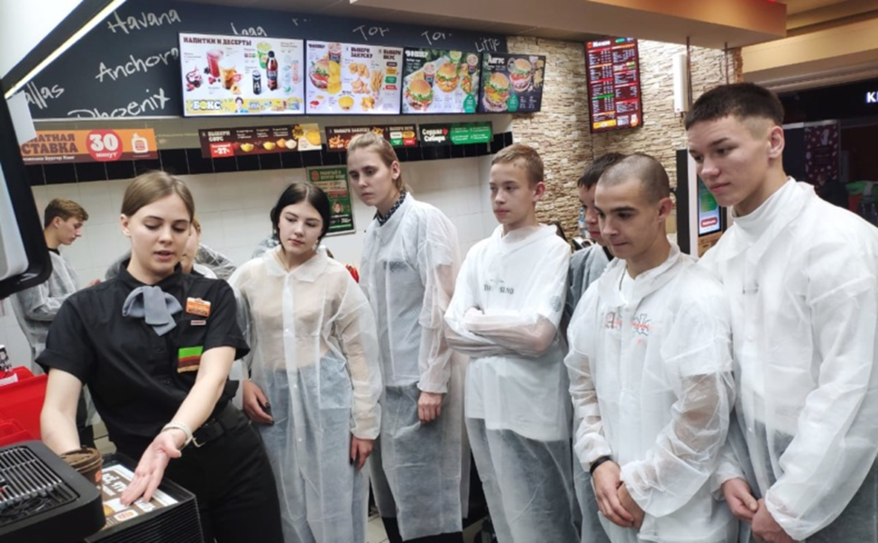 После мотивационной беседы участники прошли на производство, облачились в одноразовые костюмы и помыли руки по стандарту. Ребята посмотрели, как работает оборудование на кухне – печи, фритюрницы и другие. После всего увиденного, состоялся мастер-класс, на котором участники с помощью тренера-наставника ресторана Анастасии собрали чизбургеры по картинке-схеме.