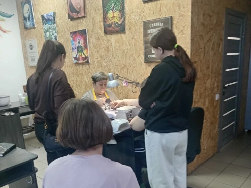 Специалист ногтевого сервиса Елена провела для участниц ознакомительную экскурсию, показав рабочее место мастера маникюра, зону стерилизации инструментов и оборудование для сушки покрытий. Она рассказала о видах маникюра, требованиях к санитарной безопасности и возможностях обучения профессии.