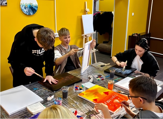 На занятии каждый участник прошёл полный цикл создания работы: от идеи и графического эскиза до воплощения в материале. Подростки работали с акриловыми красками, пастелью, текстурной бумагой и декоративными элементами. Процесс показал, как связаны творческий замысел, проектирование и практическое исполнение, требующее и художественного видения, и владения ручными техниками.